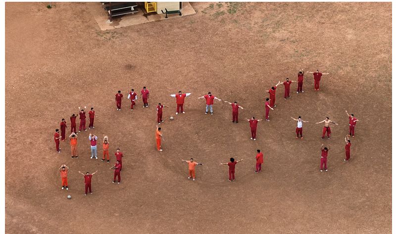 As a news drone flew over the Bluebonnet Detention Facility in Texas, Venezuelan detainees, at least some of whom are at risk of being rendered to the prison in El Salvador, formed an “SOS” message with their bodies. Photo credit: Paul Ratje/Reuters).